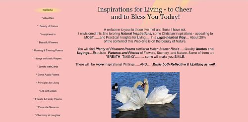 Glad you came to this Page. As you can see, I run several Inspirational Websites. Collectively speaking, you can say they are an “Oasis On The Net” (©) to bring a measure of peace and comfort, inspiration, happiness and encouragement into hearts and homes, without the imposition of pesky Google Ads and notices or intrusive Email Campaigns. These are user friendly Multi-Page Websites, not cluttered or crowded with content (many websites have too much happening on them which is a sheer distraction from what you wish to read). Each of my websites commenced with a different concept and purpose.